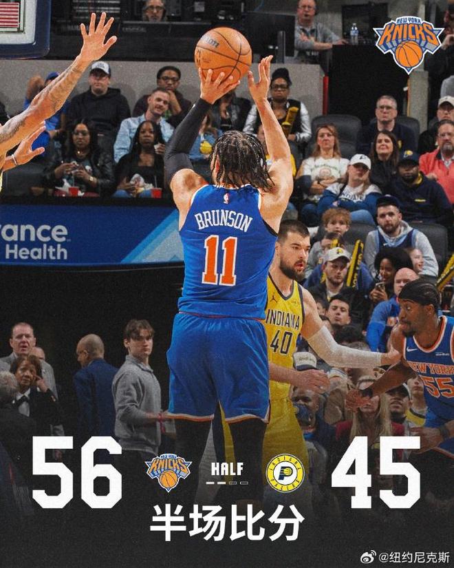 尼克斯上一场客场134-117战胜爵士,步行者过去11场遭遇11连败位列联盟倒数第一,本赛季前两次交锋双方各取一胜。本场尼克斯缺少唐斯、哈特、索汉、麦克布莱德,步行者缺少哈利伯顿、西亚卡姆。首节前5分钟双方缠斗至8-8,尼克斯内外开花一波9-0攻势取得领先,托平三分追分。布伦森中投得分,步行者连追5分,尼克斯维持微弱领先优势,首节比赛结束尼克斯24-21领先步行者。首节步行者三分11中3,尼克斯三分6中1,布伦森9中5得到11分。