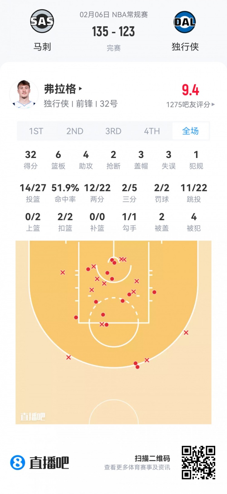 独行侠状元秀弗拉格 登场38.5分钟