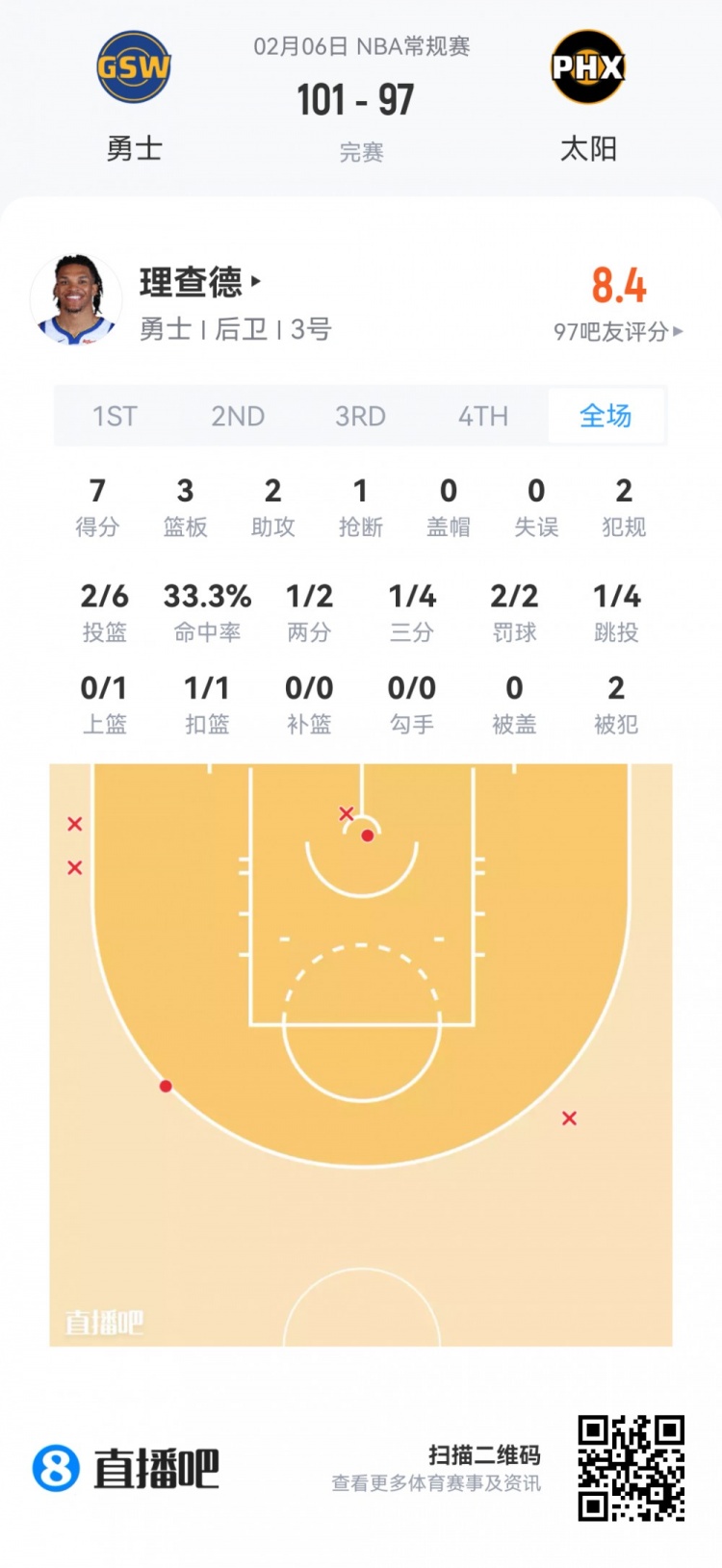 勇士次轮56号秀威尔·理查德 登场27.3分钟