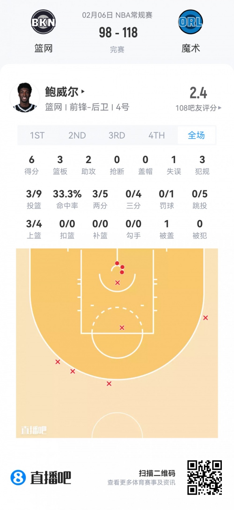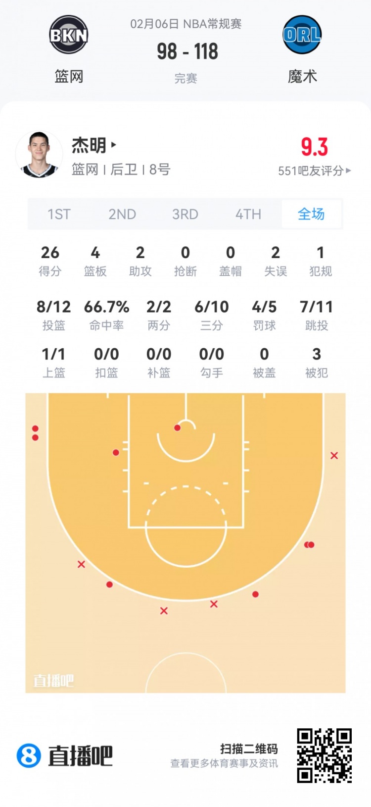 篮网首轮8号秀叶戈尔·杰明 登场32分钟