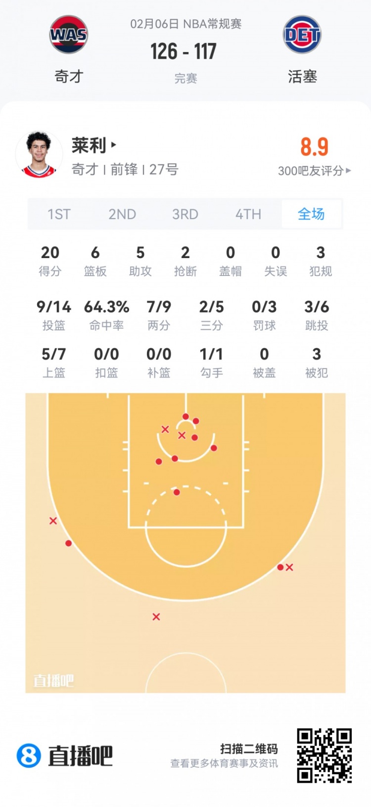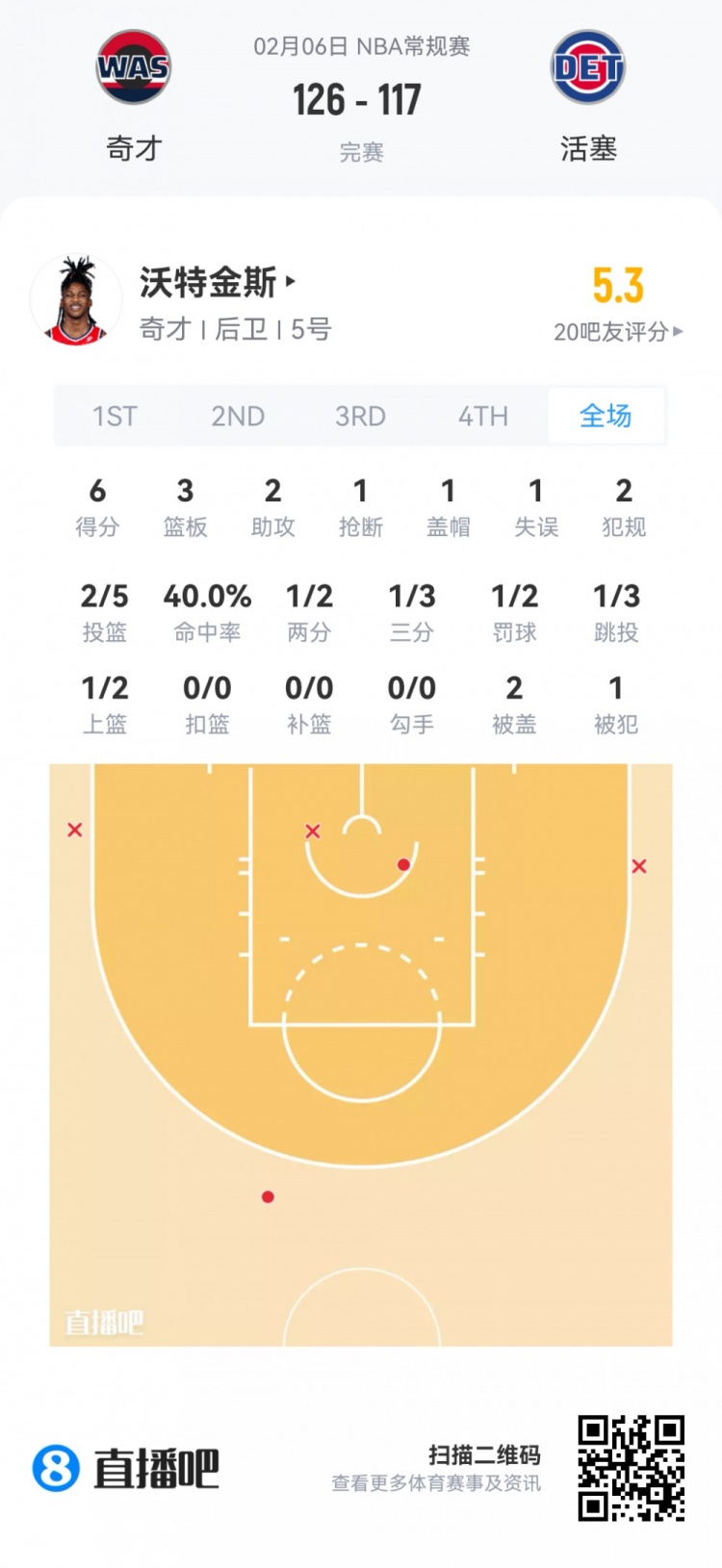 奇才次轮43号秀沃特金斯 登场25.9分钟