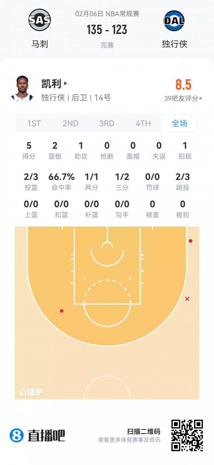 独行侠落选秀迈尔斯·凯利 登场8.9分钟