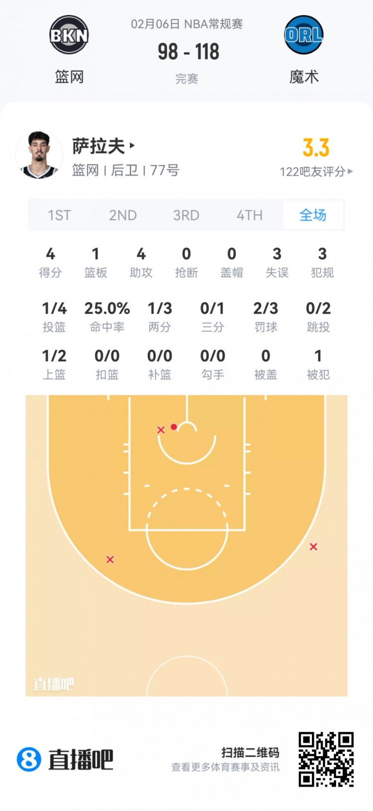 篮网首轮26号秀萨拉夫 登场16.1分钟