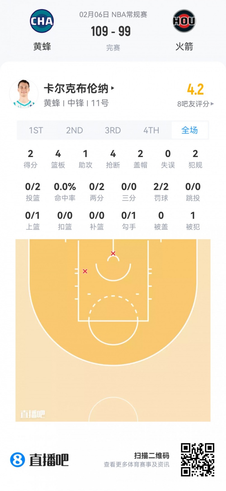 黄蜂次轮34号秀卡尔克布伦纳 登场18.7分钟