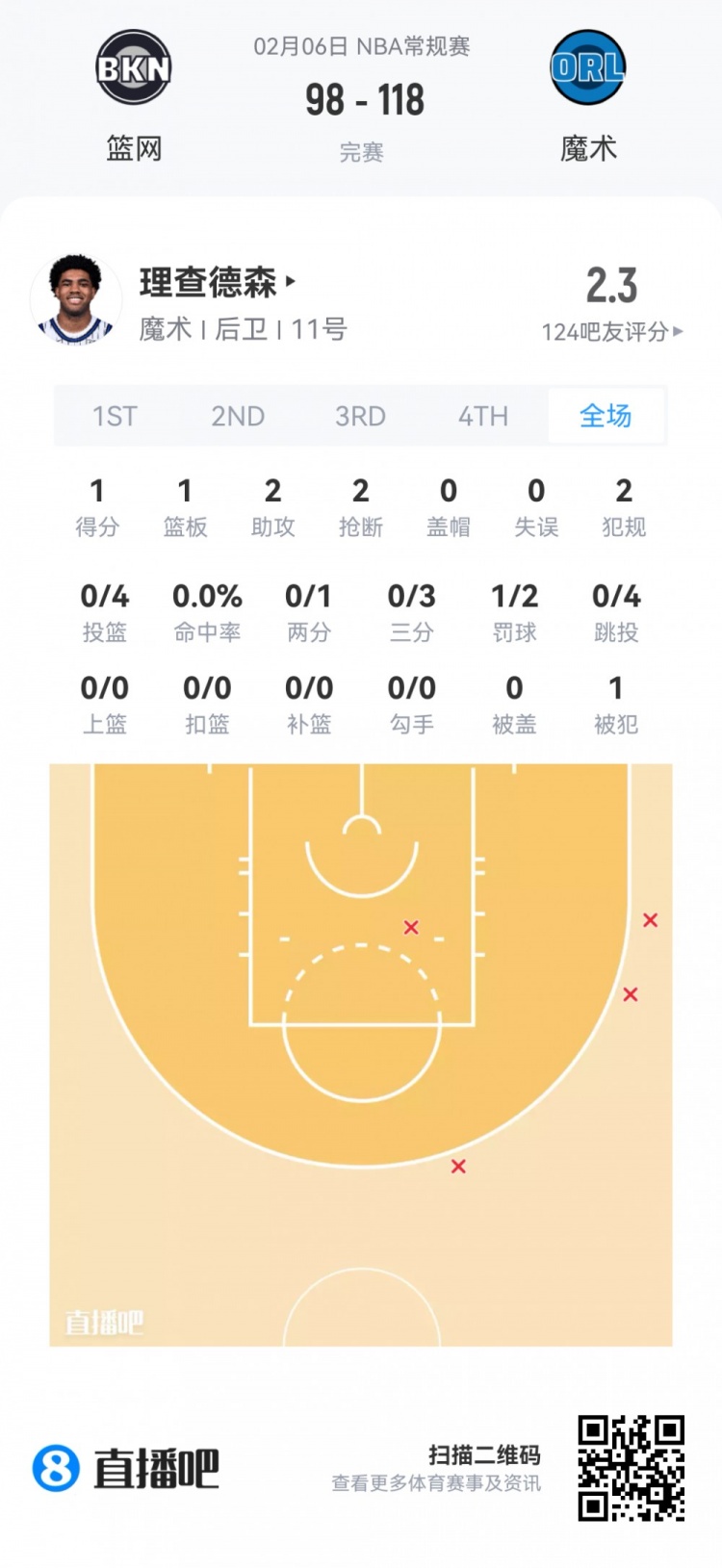 魔术首轮25号秀理查德森 登场22.5分钟