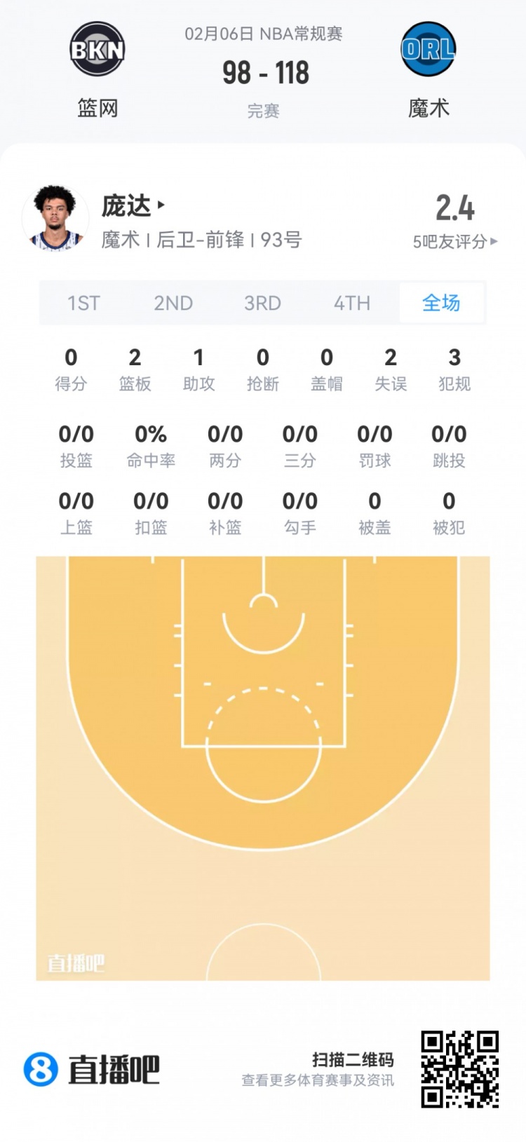 魔术次轮32号秀诺厄·庞达 登场14.2分钟