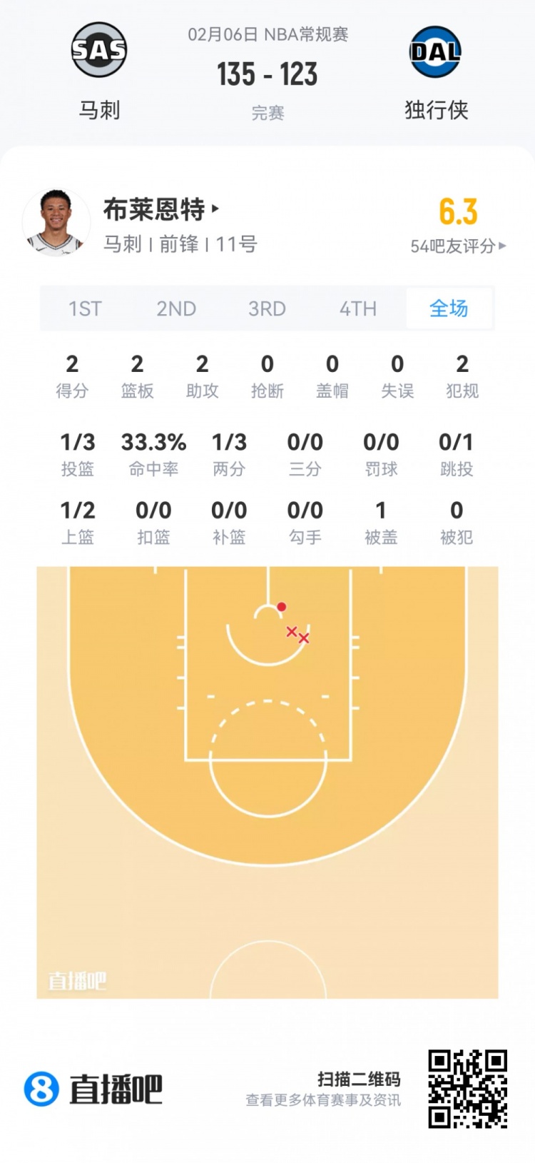 马刺首轮14号秀卡特·布莱恩特 登场17.9分钟