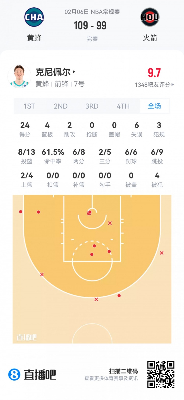 黄蜂首轮4号秀克尼佩尔 登场32.4分钟