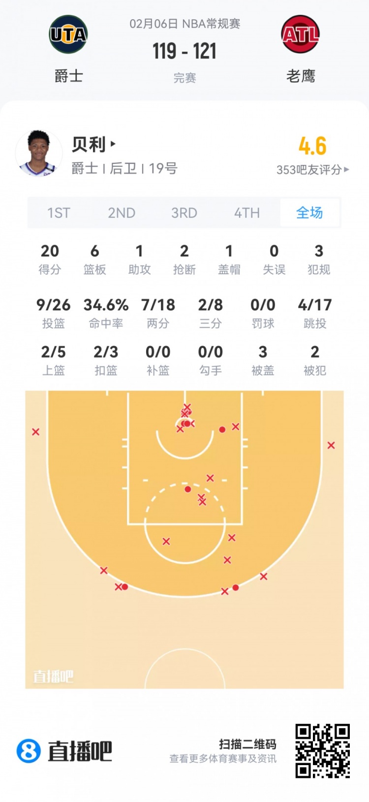 爵士首轮5号秀埃斯·贝利 登场40.4分钟