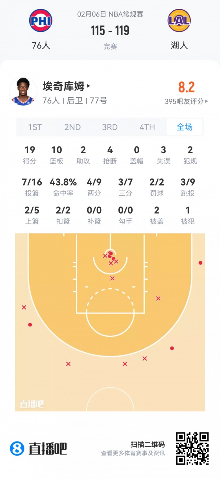 76人探花秀埃奇库姆 登场39.2分钟