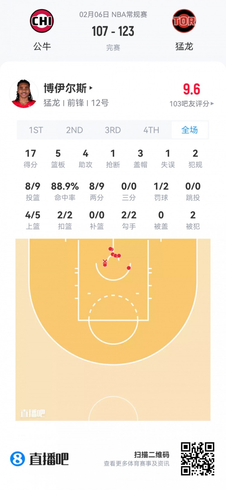 猛龙首轮9号秀博伊尔斯 登场37.2分钟