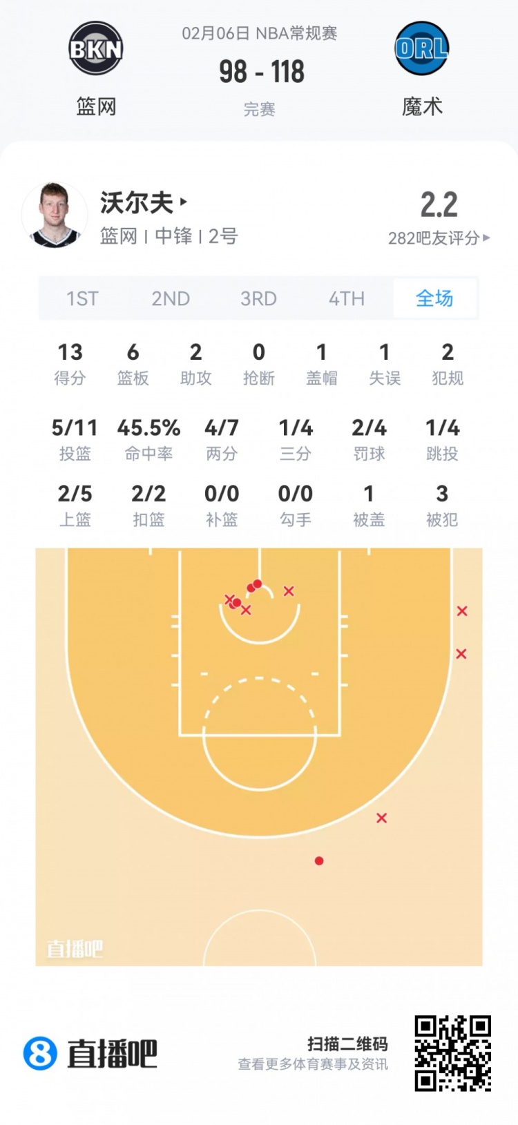 篮网首轮27号秀沃尔夫 登场21.9分钟