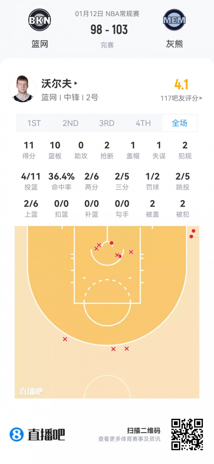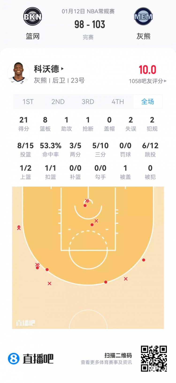灰熊首轮11号秀科沃德 登场26.6分钟