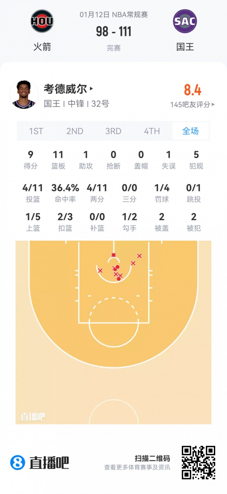 国王落选秀考德威尔 登场18.8分钟