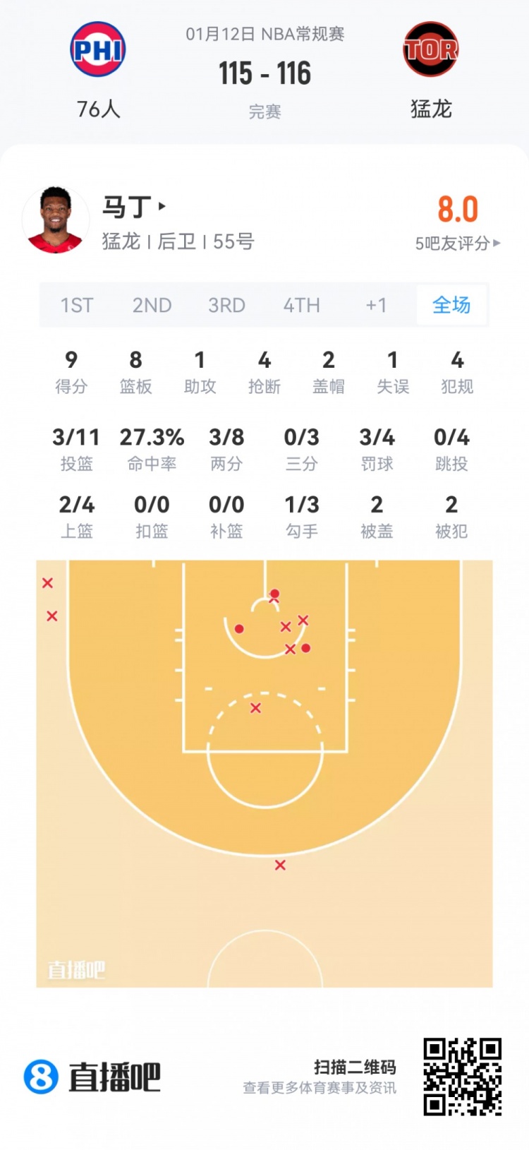 猛龙次轮39号秀阿利贾·马丁 登场29.7分钟