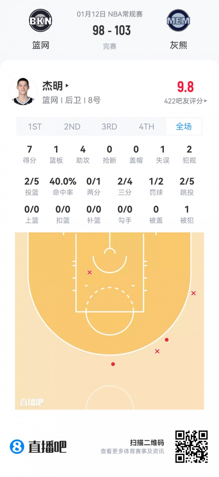 篮网首轮8号秀叶戈尔·杰明 登场28.4分钟