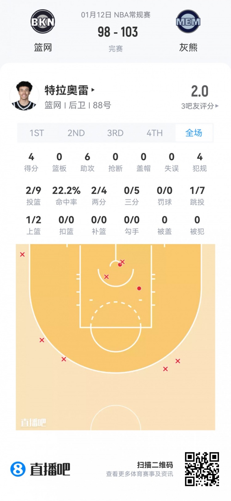 篮网首轮19号秀特拉奥雷 登场19.7分钟
