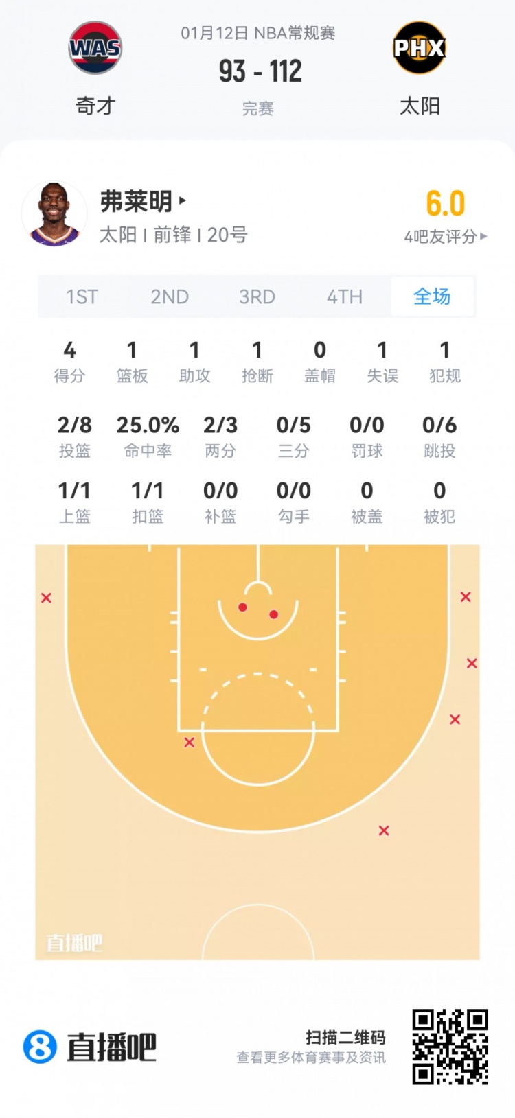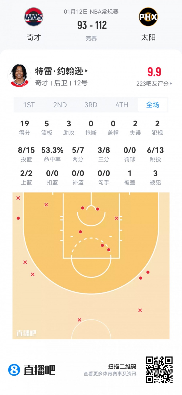 奇才首轮6号秀特雷·约翰逊 登场30.4分钟