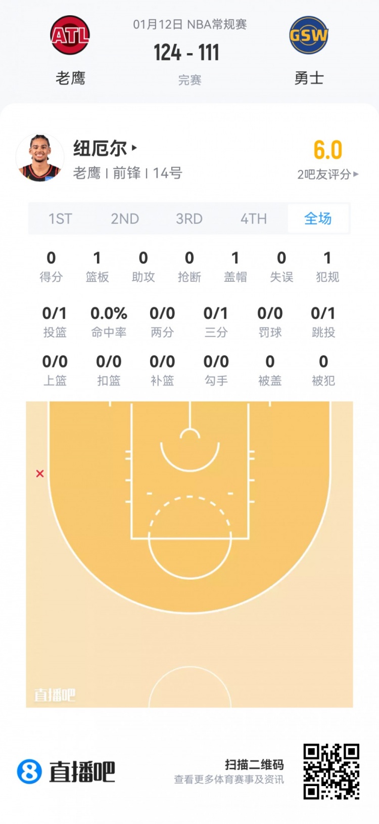老鹰首轮23号秀阿萨·纽厄尔 登场3.6分钟