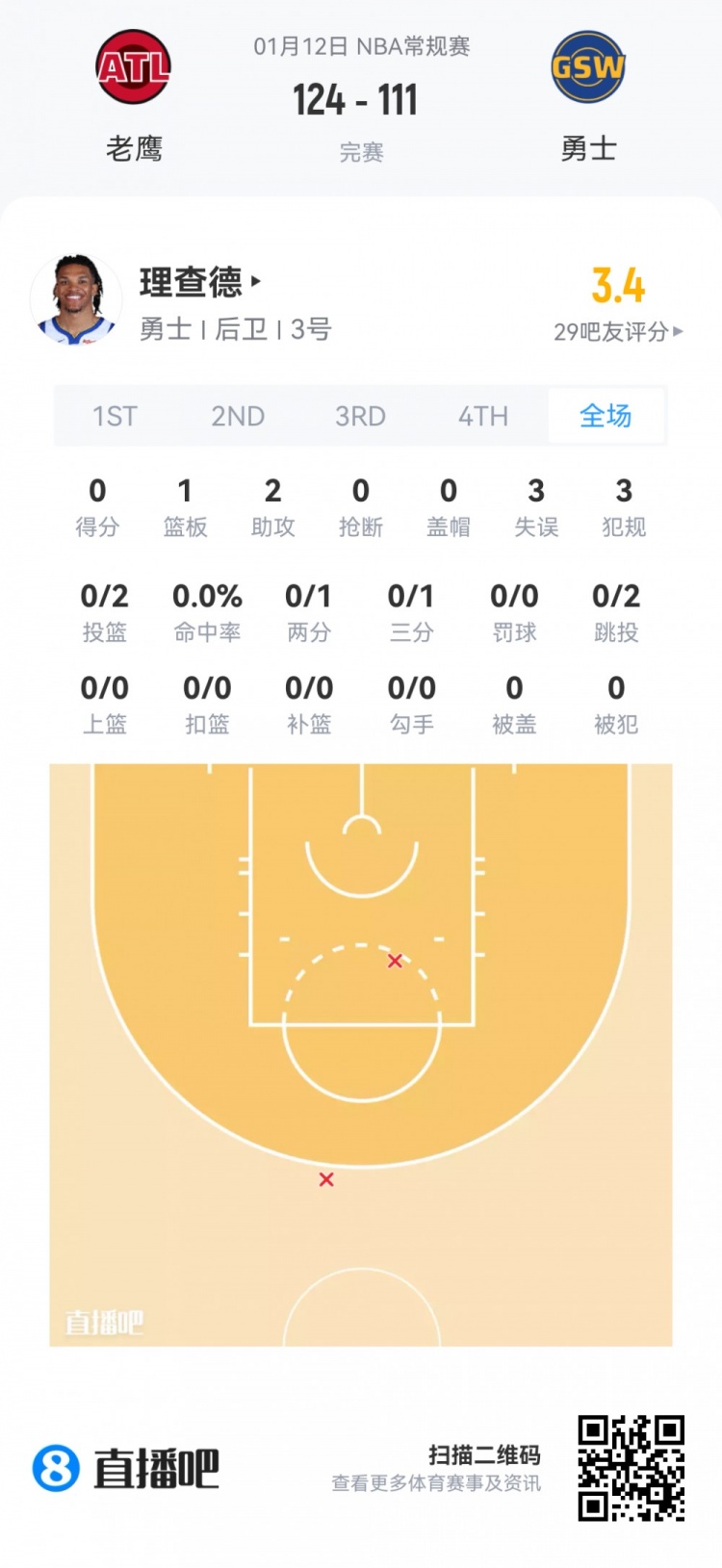 勇士次轮56号秀威尔·理查德 登场12.3分钟
