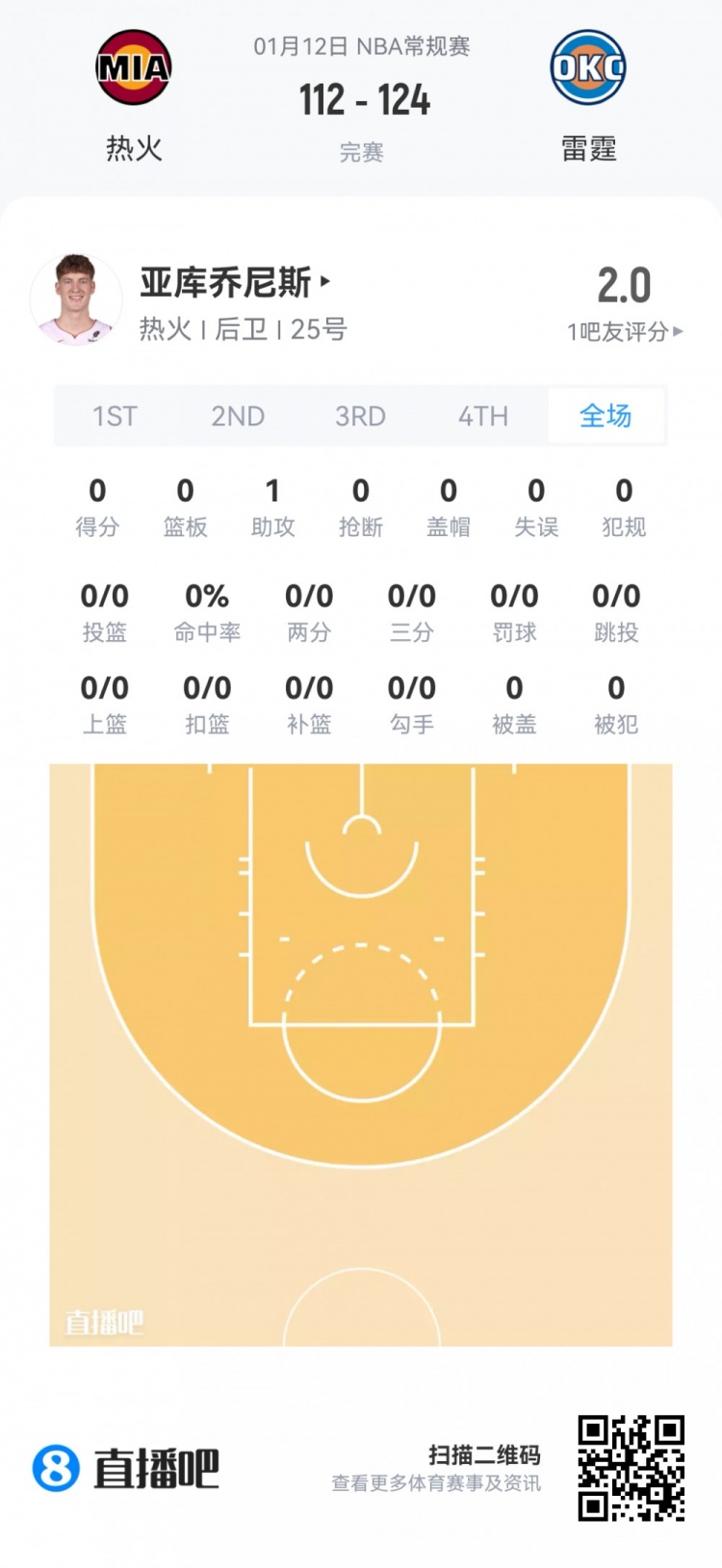 热火首轮20号秀亚库乔尼斯 登场1.6分钟