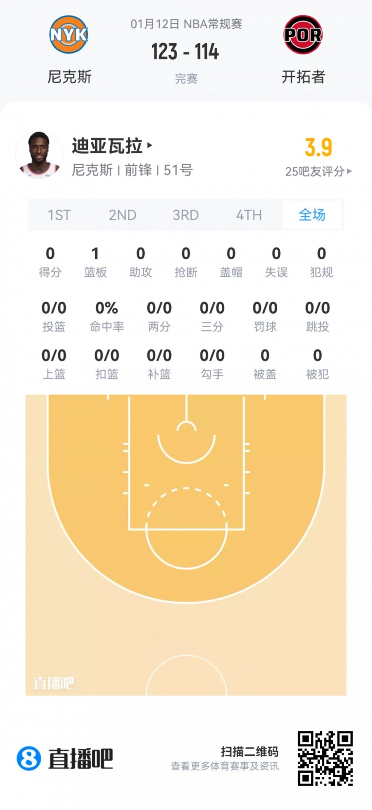 尼克斯次轮51号秀穆罕默德·迪亚瓦拉 登场2.7分钟
