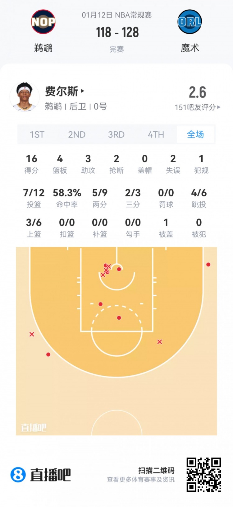 鹈鹕首轮7号秀费尔斯 登场28.1分钟
