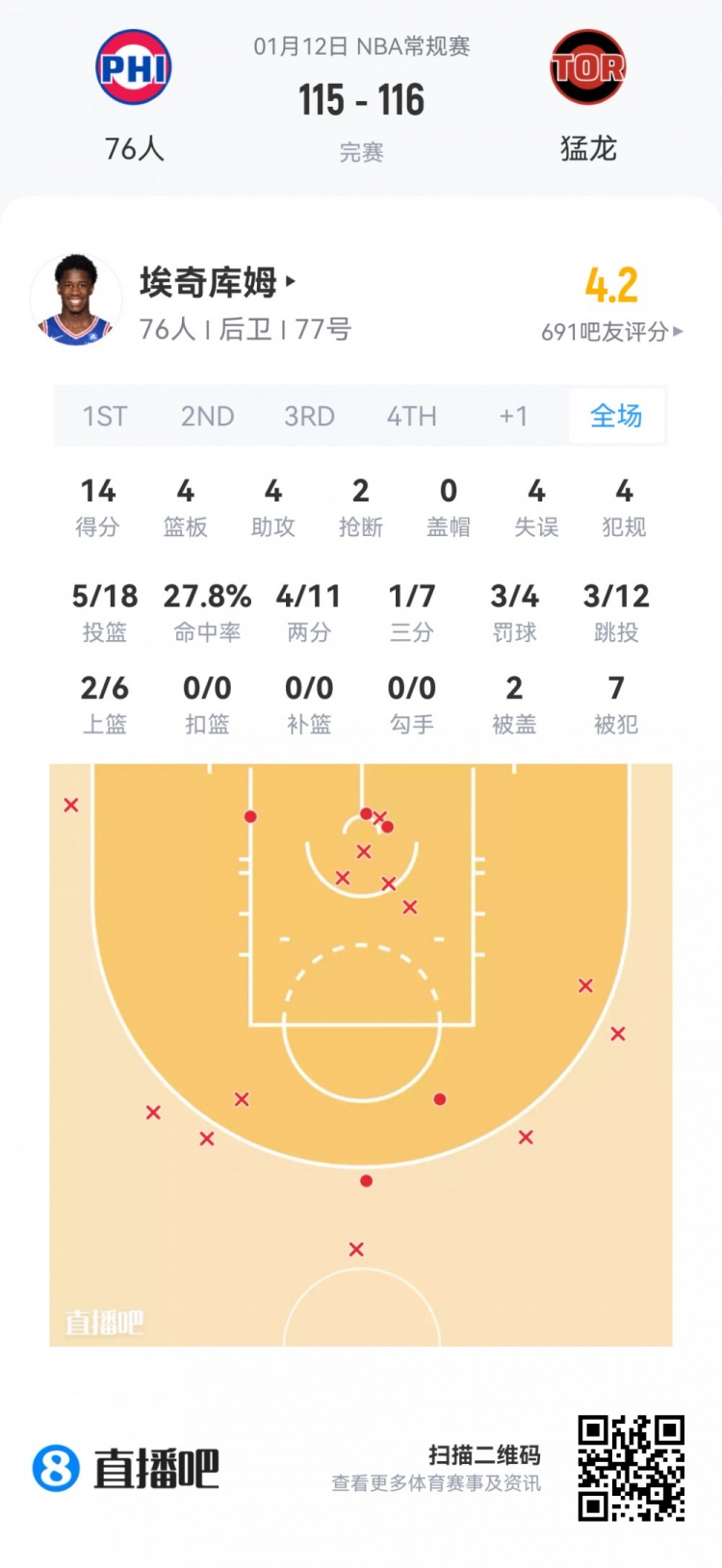76人探花秀埃奇库姆 登场44.6分钟