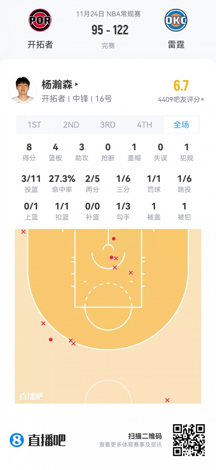 开拓者首轮16号秀杨瀚森 登场17.6分钟