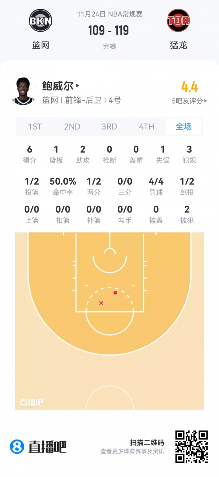 篮网首轮22号秀德雷克·鲍威尔 登场14.5分钟