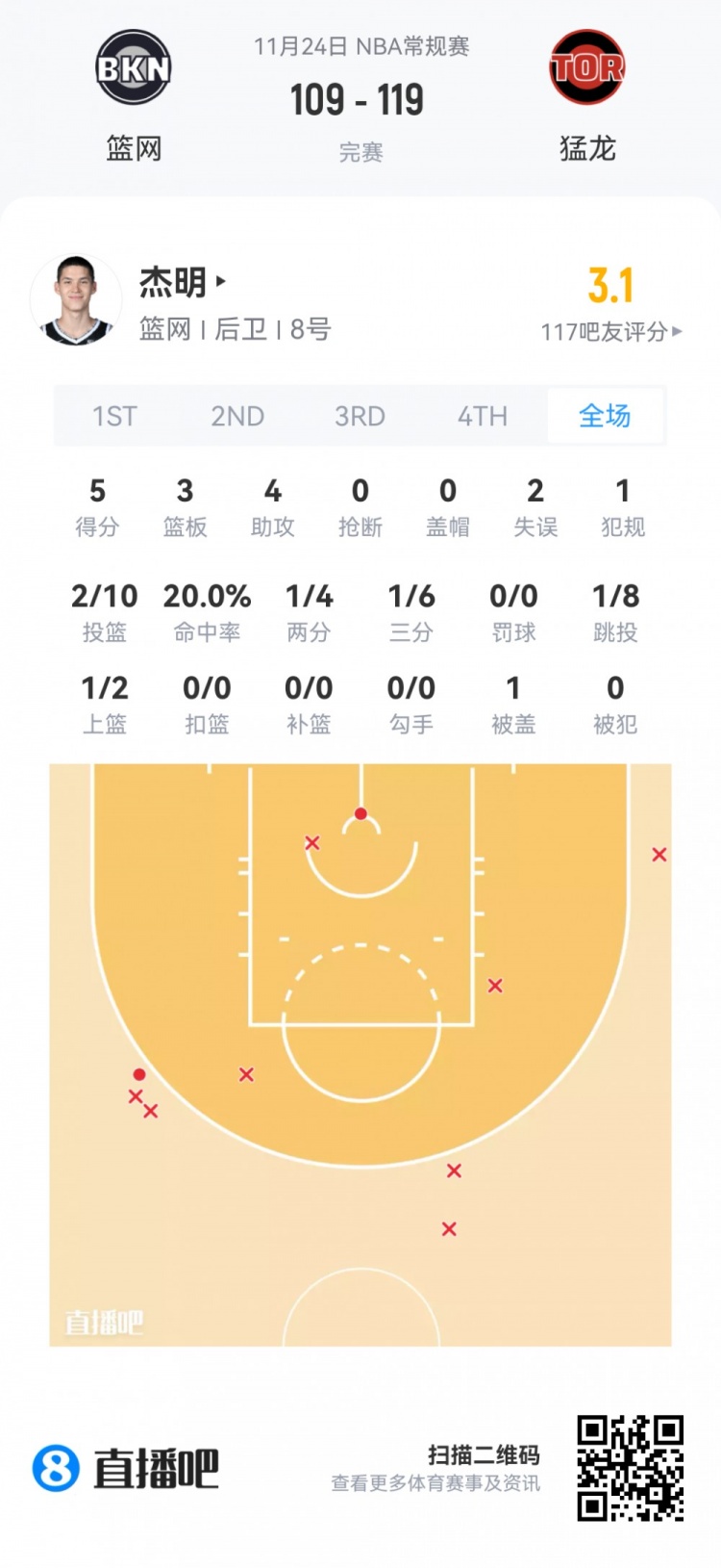 篮网首轮8号秀叶戈尔·杰明 登场28.1分钟