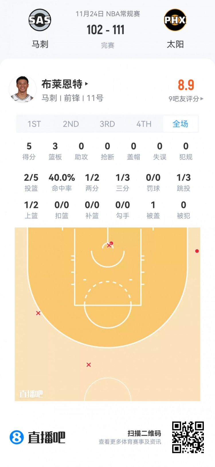 马刺首轮14号秀卡特·布莱恩特 登场7.8分钟