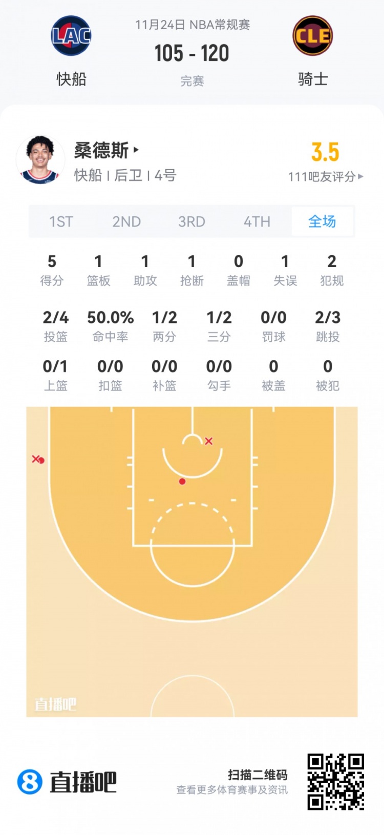 快船次轮50号秀科比·桑德斯 登场27.7分钟