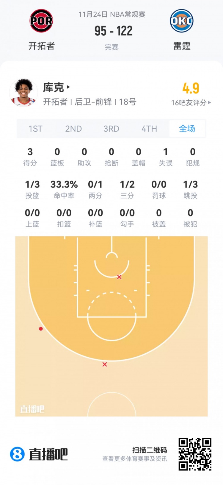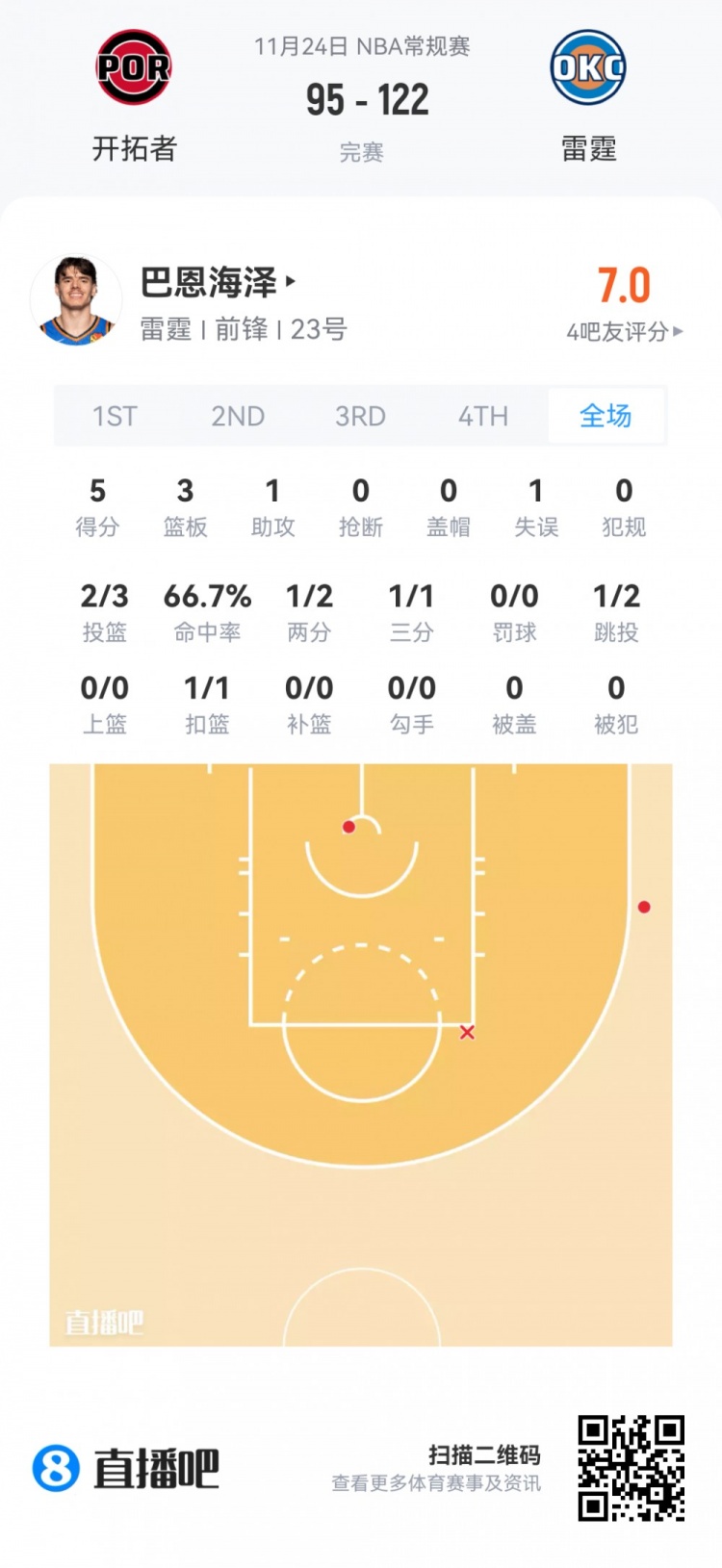 雷霆次轮44号秀布鲁克斯·巴恩海泽 登场8.2分钟