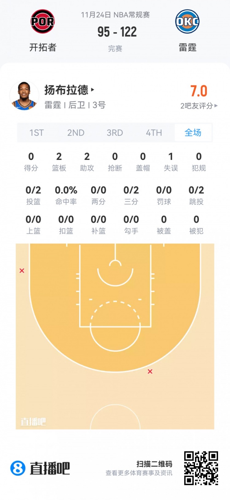 雷霆落选秀克里斯·扬布拉德 登场8分钟