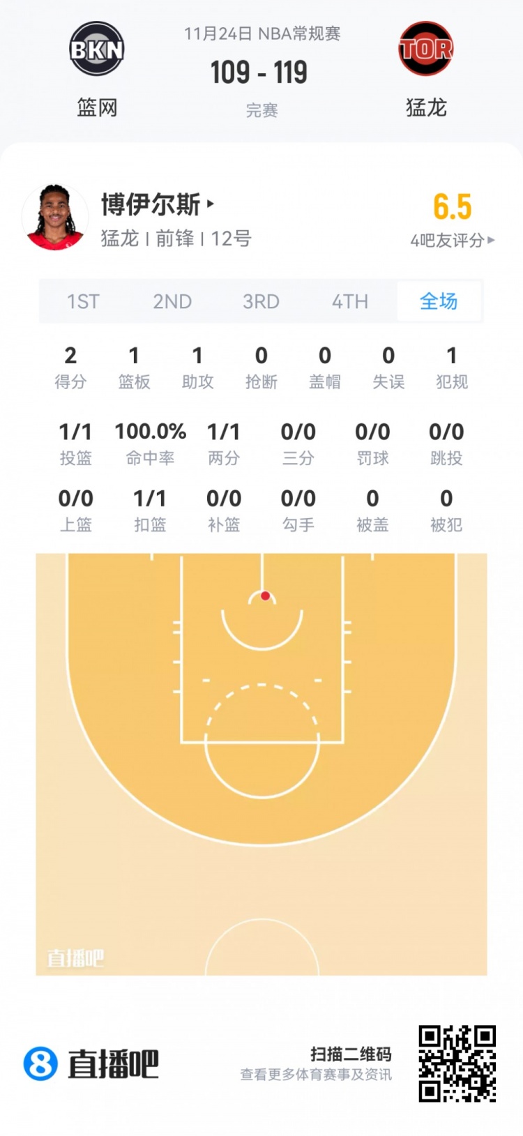猛龙首轮9号秀科林·穆雷·博伊尔斯 登场17.1分钟