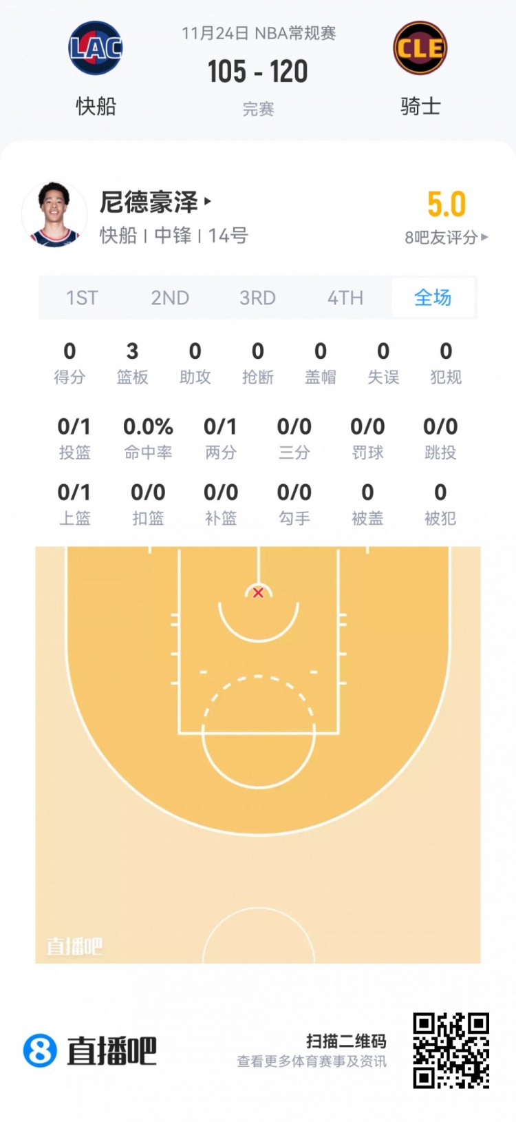 快船首轮30号秀亚尼克·尼德豪泽 登场3.5分钟