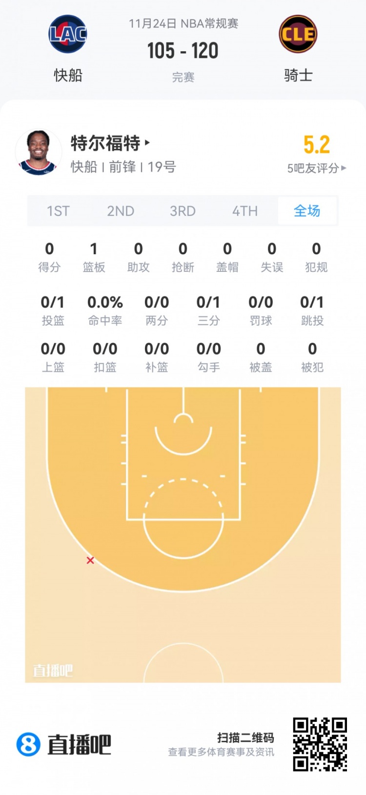 快船落选秀贾米尔·特尔福特 登场3.5分钟