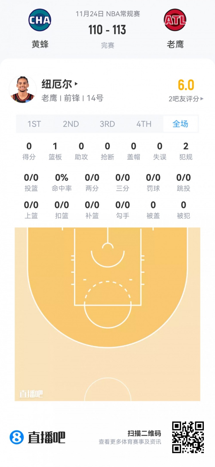 老鹰首轮23号秀阿萨·纽厄尔 登场4.5分钟