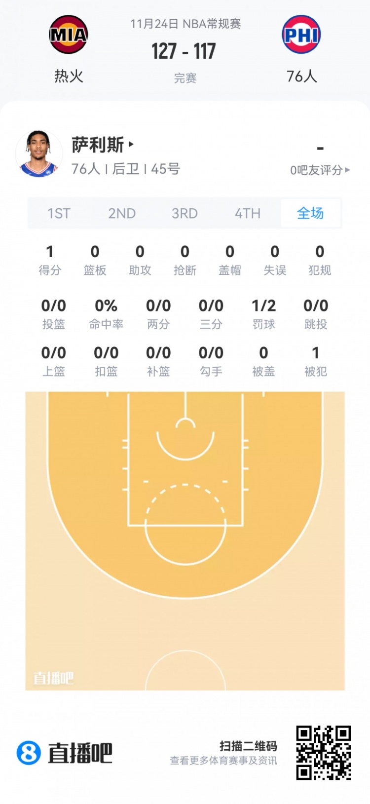 76人落选秀亨特·萨利斯 登场1.2分钟