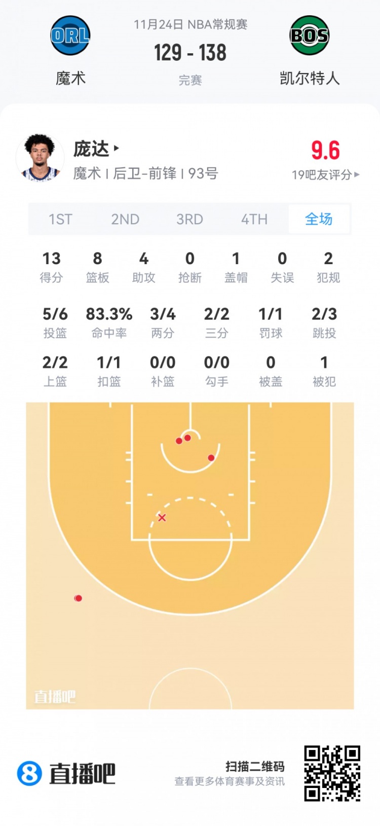 魔术次轮32号秀诺厄·庞达 登场23.3分钟