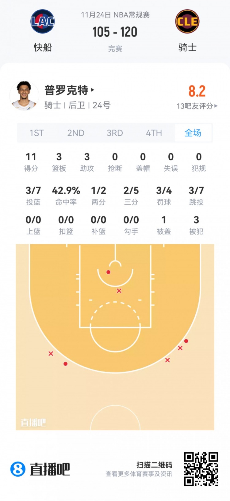 骑士次轮49号秀泰瑞斯·普罗克特 登场17.1分钟
