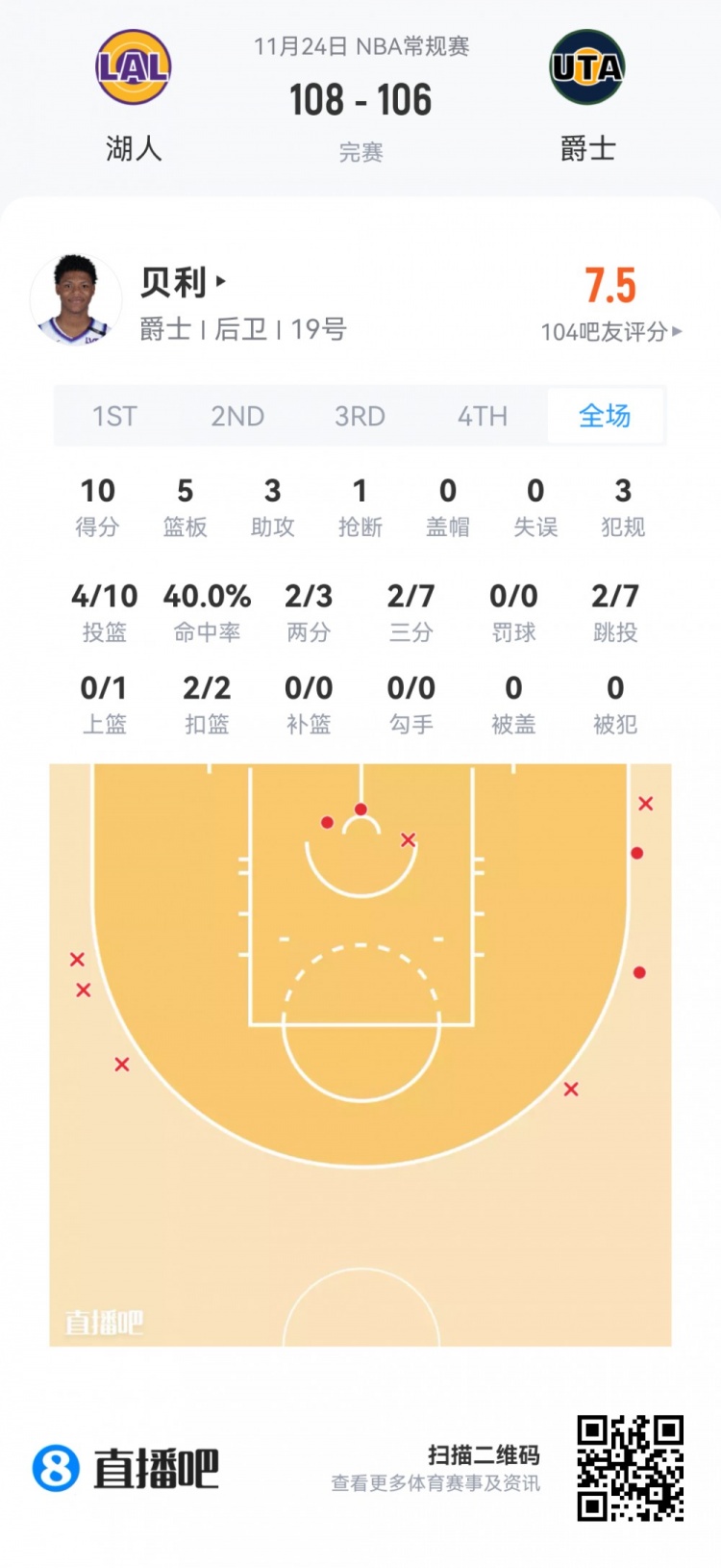 爵士首轮5号秀埃斯·贝利 登场31.7分钟