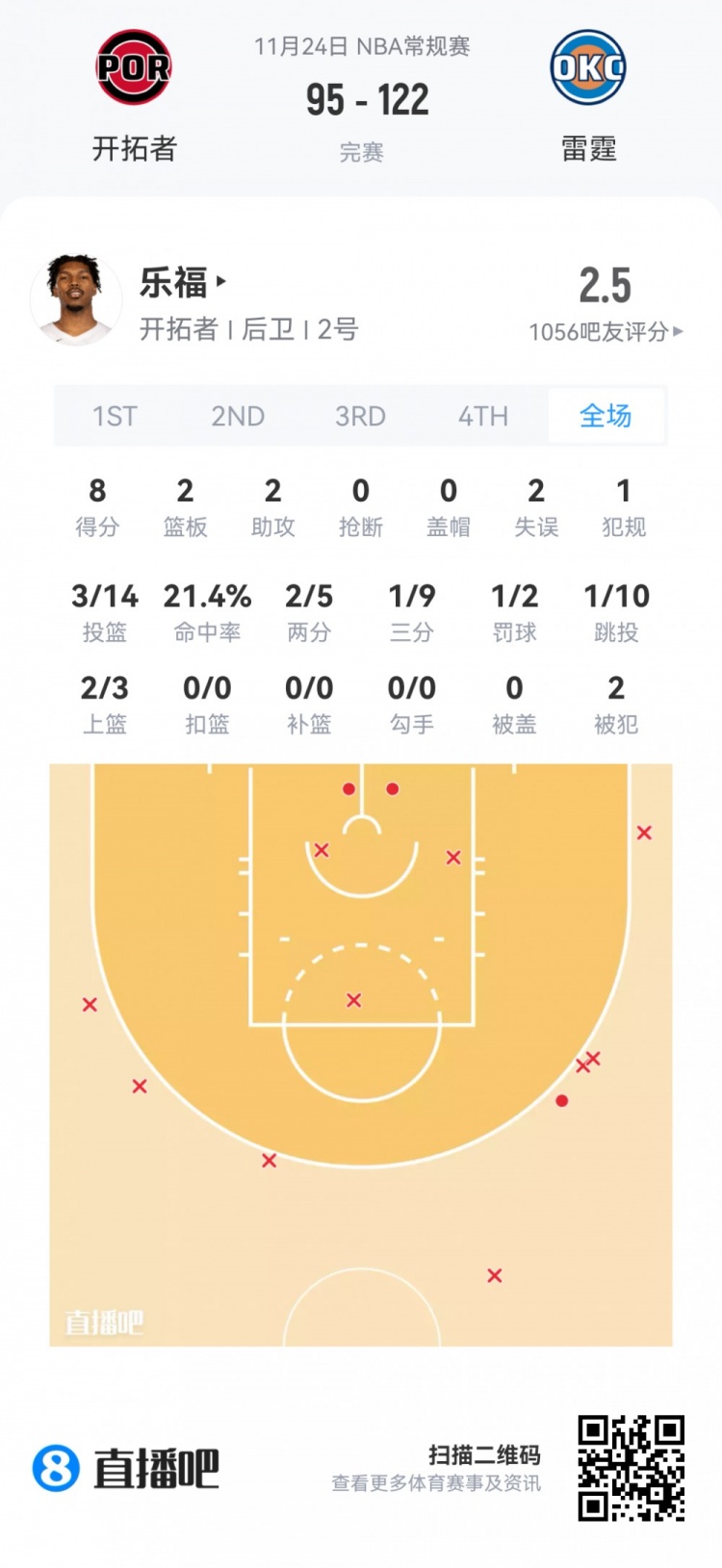 开拓者落选秀凯莱布·乐福 登场25.7分钟