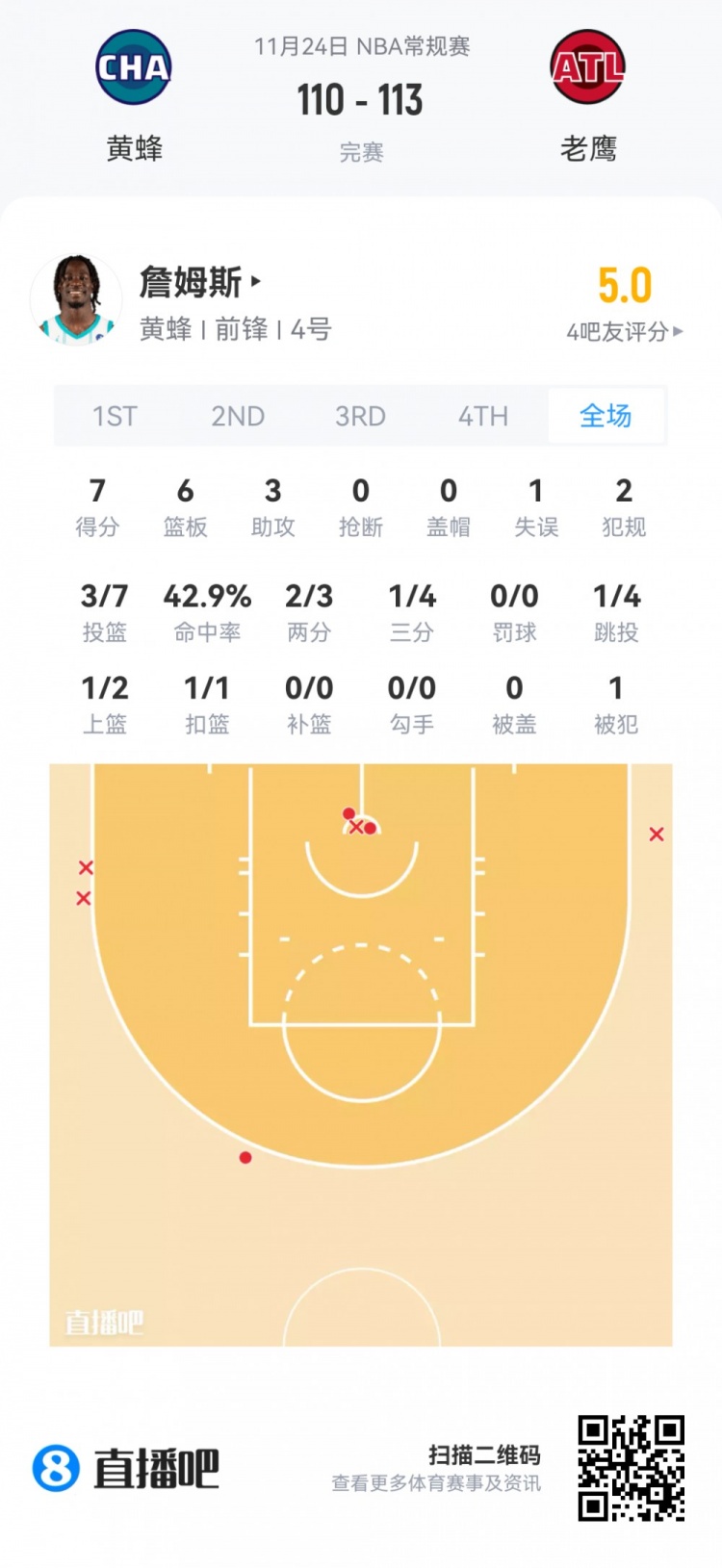 黄蜂次轮33号秀赛恩·詹姆斯 登场32.2分钟