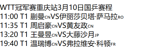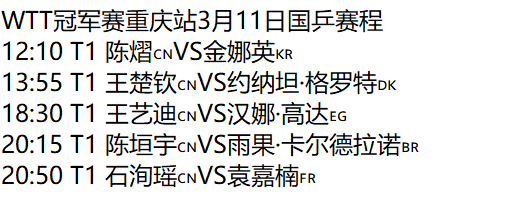 3月11日:王楚钦亮相,陈垣宇再战雨果