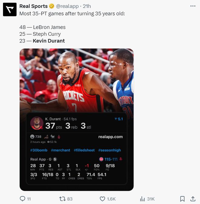 杜兰特35岁以上拿到23次30+也是历史第三,仅次于詹姆斯、库里,要知道这场比赛杜兰特只打了短短28分钟而已。