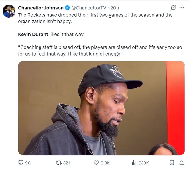 赛后杜兰特接受采访明显能感觉一丝的不悦,他说道:我投丢了9个球,我真的觉得我可以连中18个球,很难受。教练组与球员们都很恼火,但这一波二连败或许对这支球队来说是一个变好的信号。目前才开赛,大家都想渴求胜利,我喜欢这种氛围。