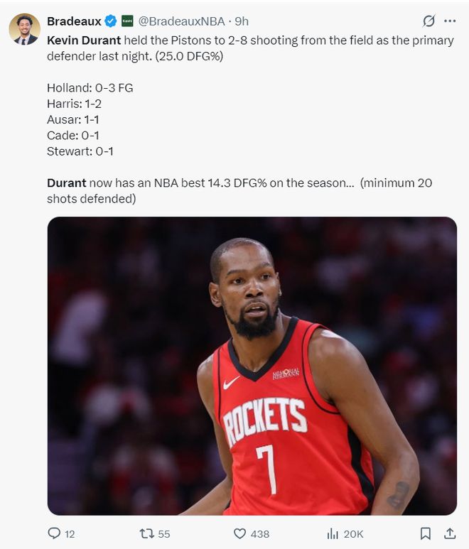 37岁的杜兰特真的已经竭尽全力了,对活塞他作为防守者时,霍兰德3中0、哈里斯2中1、奥萨尔1中1、CC1中0、斯图尔特1中0,他的防守回合转化率达到14.3%已经是联盟最顶级的防守者。