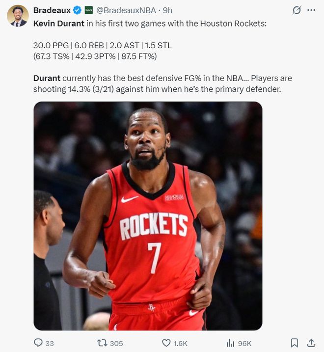 火箭这两场比赛杜兰特场均30分6篮板2助攻1.5抢断,真实命中率67.3%,三分命中率42.9%,罚球命中率87.5%,他作为防守者时对手合计21中3,杜兰特如此出色的攻防表现火箭却吞下二连败!